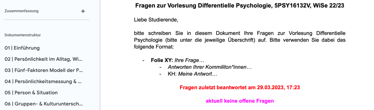 Google-Doc, in dem Studierende anonym Fragen zur Vorlesung stellen und sich diese gegenseitig beantworten können.